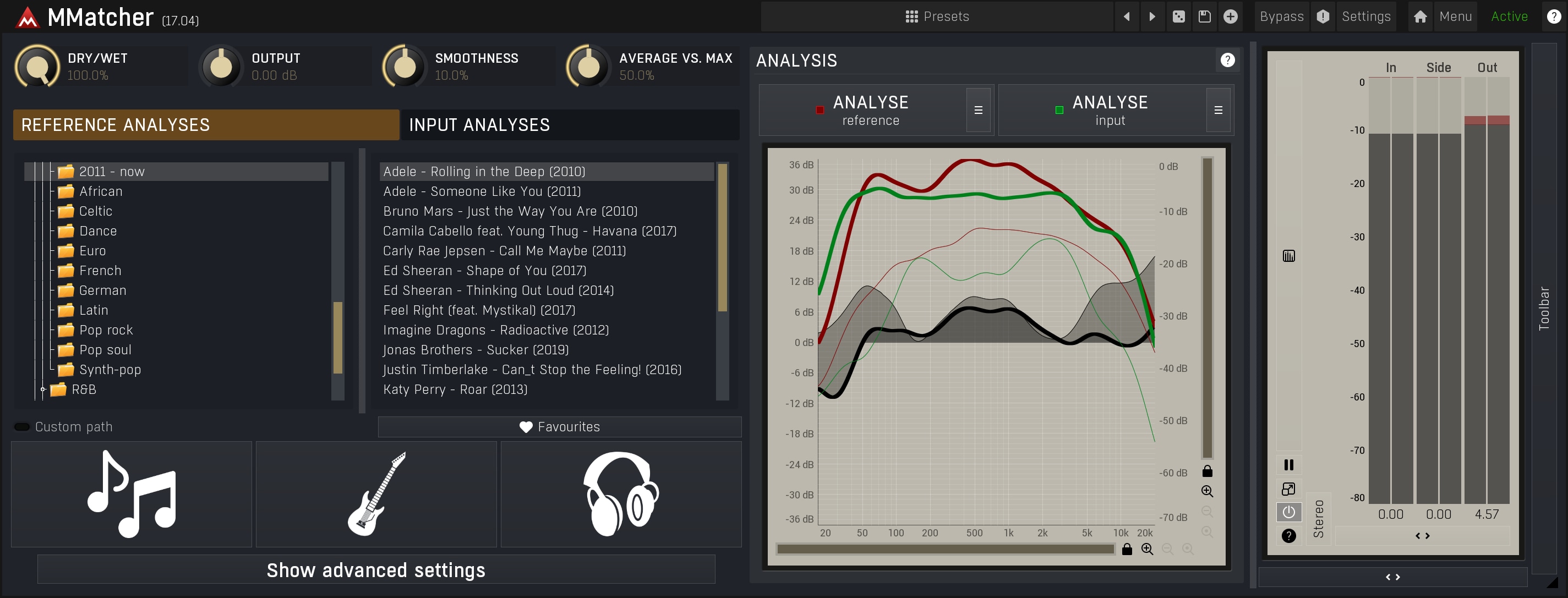 MMatcher is designed for intuitive and rapid workflow. Achieving precise sonic matching is streamlined into three simple steps, all accomplished within seconds. First, analyze your recording. Second, match it to a reference from our extensive database or analyse whatever reference you have in mind. This straightforward approach allows you to focus on your creative vision, not complex technical adjustments.