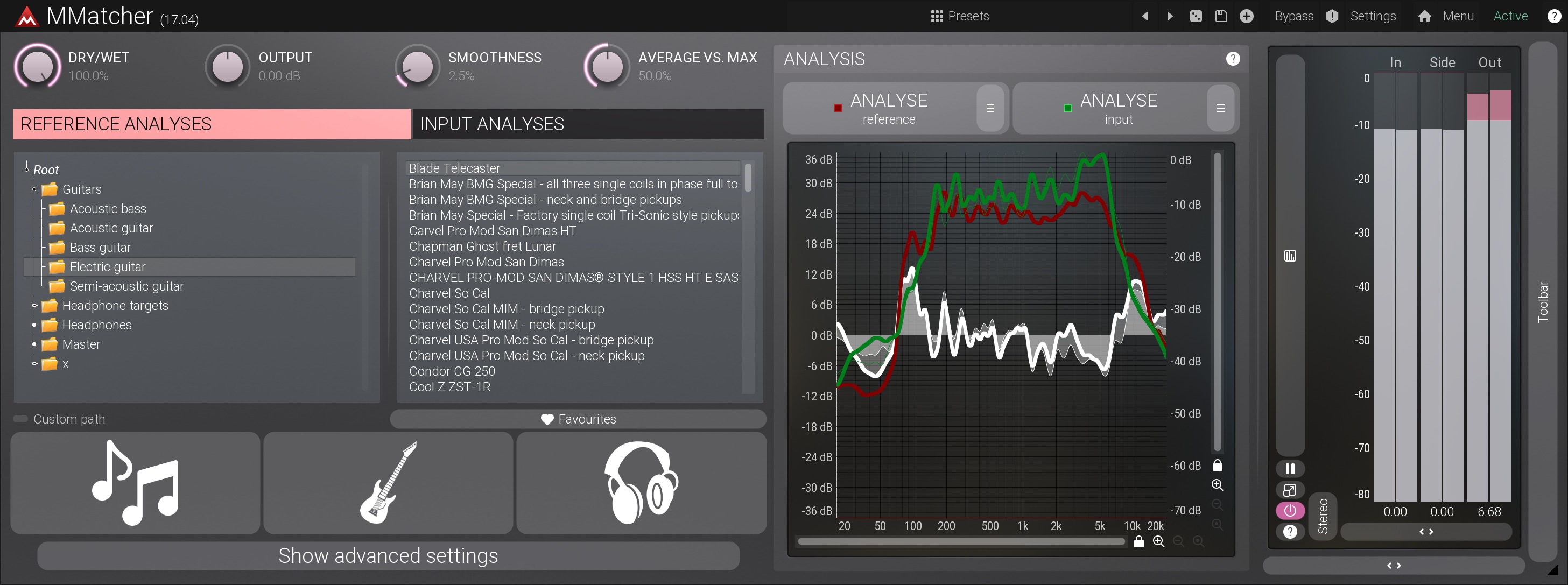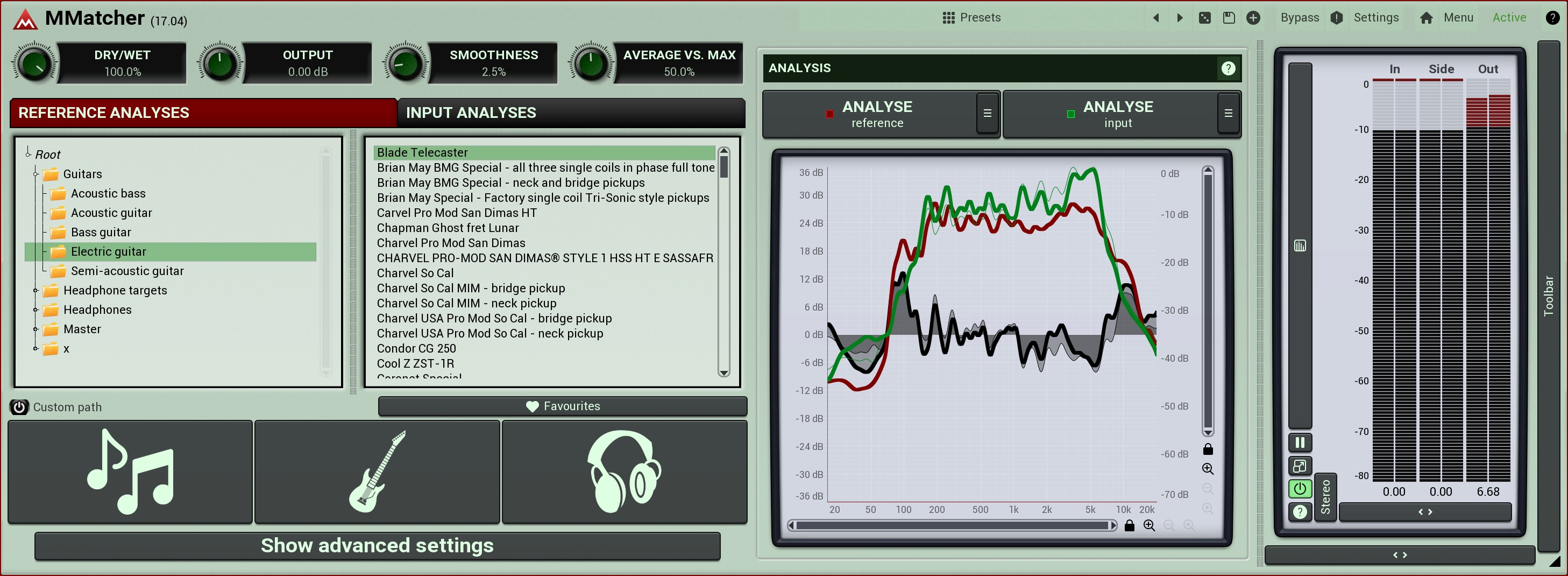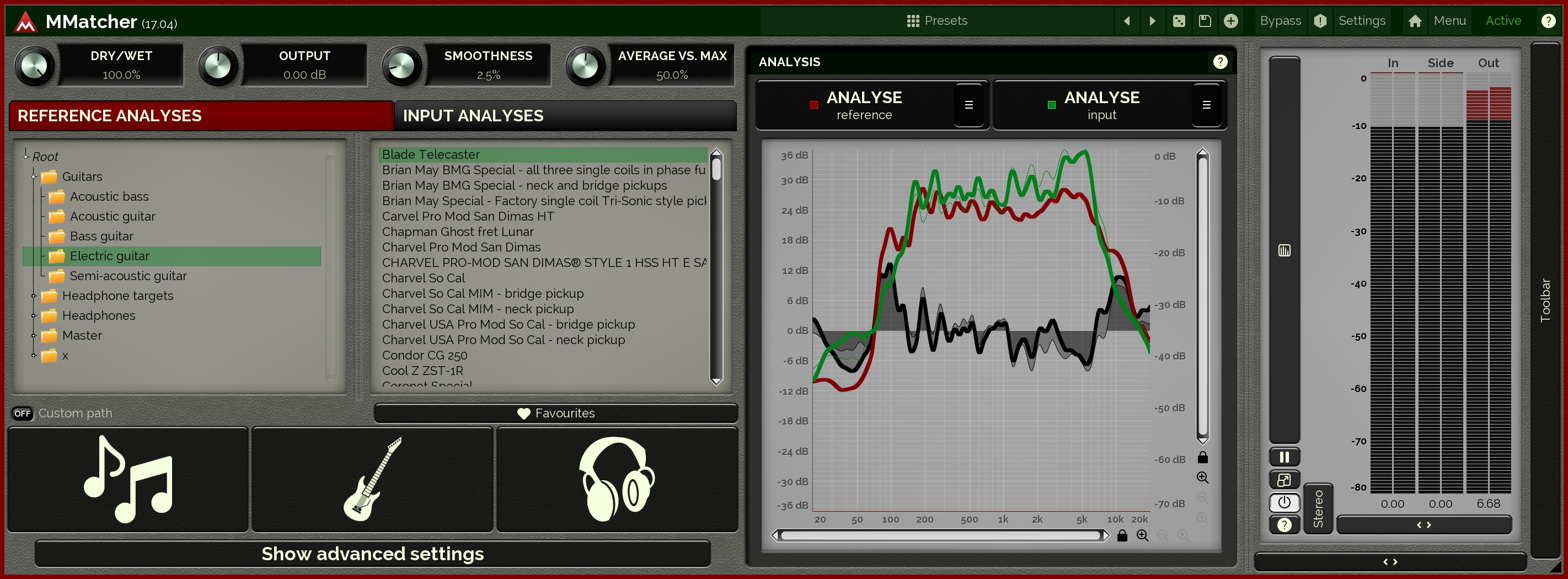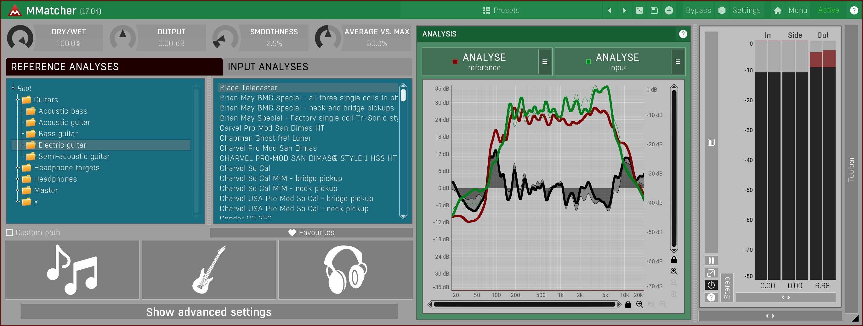 MMatcher provides a specialized database of dry electric guitar and bass sounds, created by analysing samples from hundreds of guitars sent by our users. This database allows you to experiment with and refine your instrument tones. By analyzing your guitar sound input and comparing it to these references, you can explore new sonic possibilities. The plugin simplifies the process of achieving desired guitar and bass tones. This feature offers a creative playground for guitarists and bassists, enabling them to discover and perfect their unique sound, all powered by the collective sonic experience of our user community.