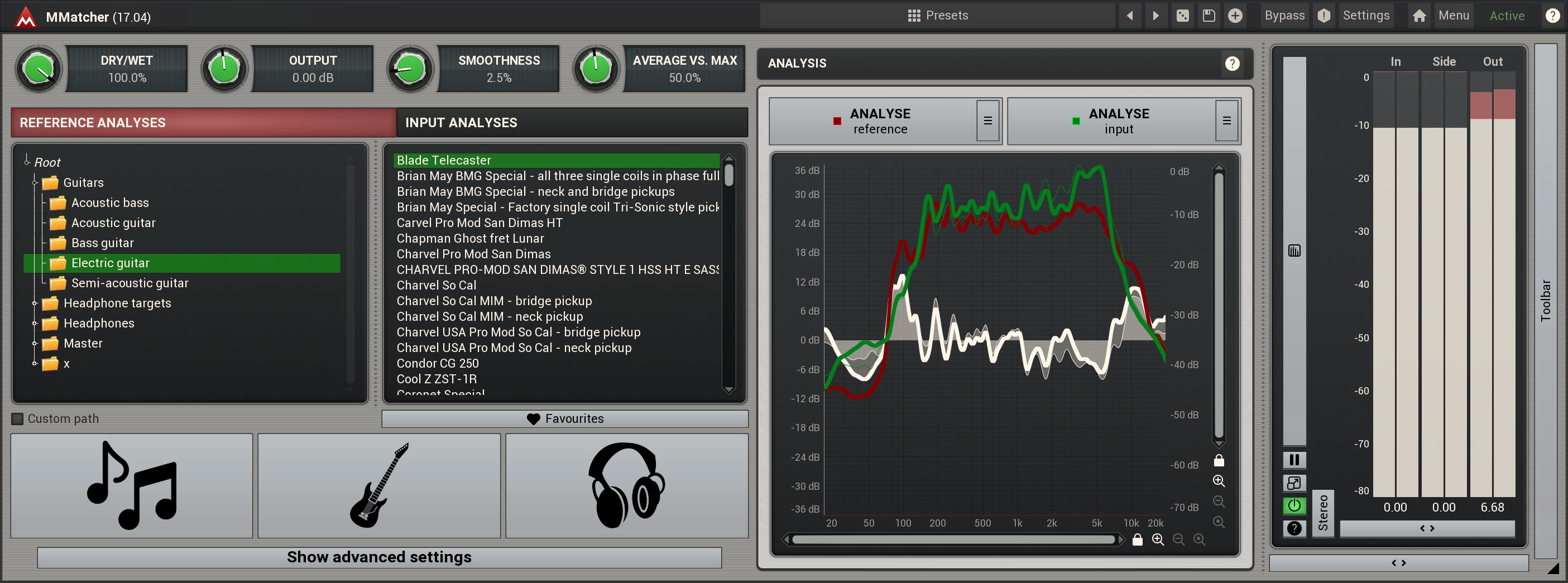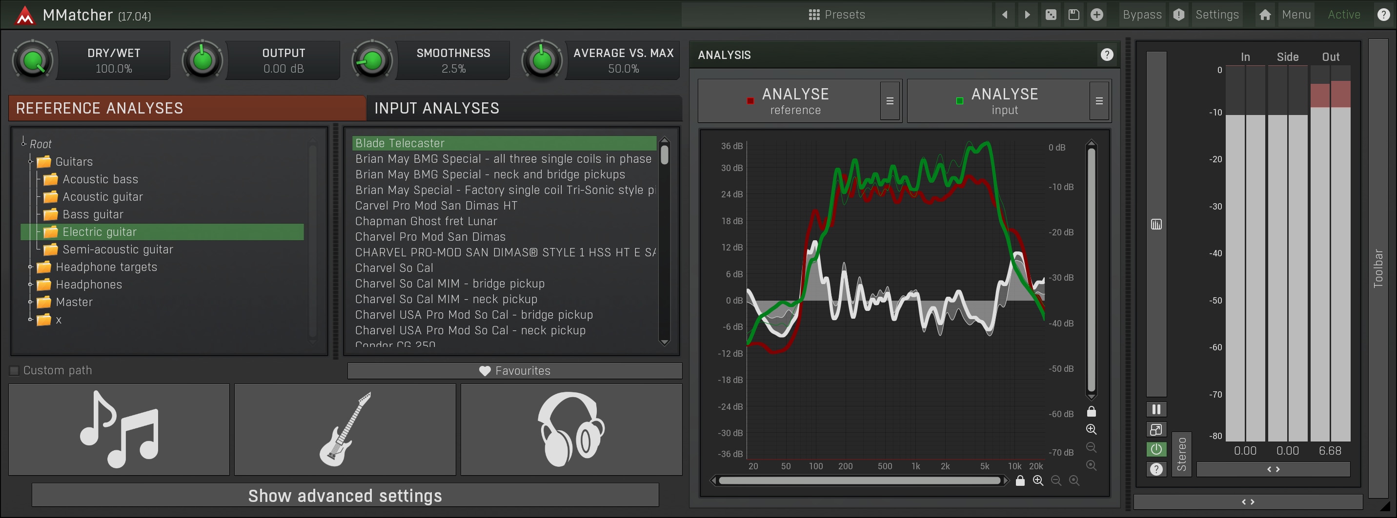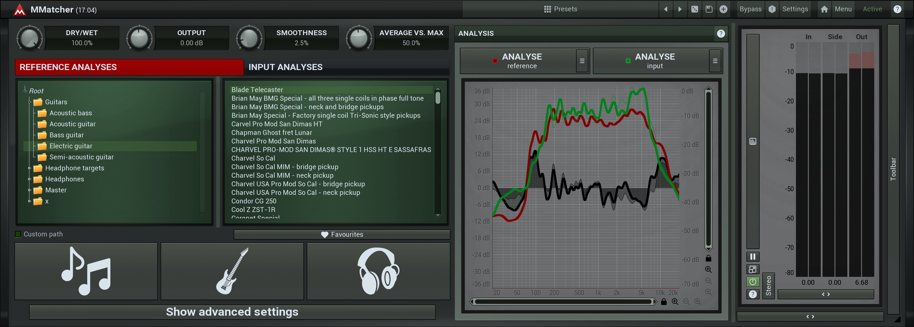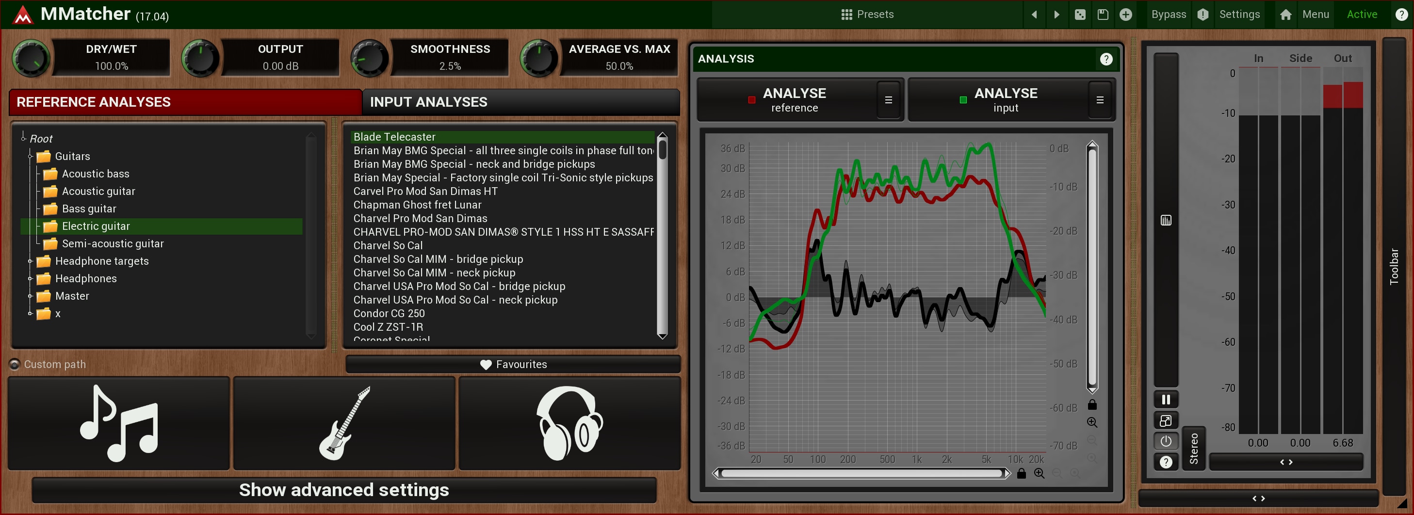 MMatcher provides a specialized database of dry electric guitar and bass sounds, created by analysing samples from hundreds of guitars sent by our users. This database allows you to experiment with and refine your instrument tones. By analyzing your guitar sound input and comparing it to these references, you can explore new sonic possibilities. The plugin simplifies the process of achieving desired guitar and bass tones. This feature offers a creative playground for guitarists and bassists, enabling them to discover and perfect their unique sound, all powered by the collective sonic experience of our user community.