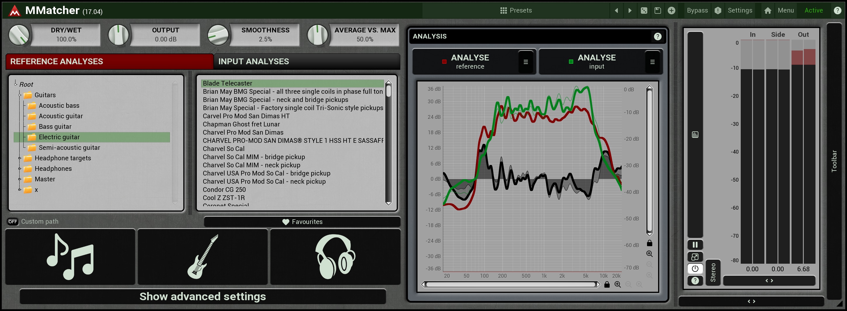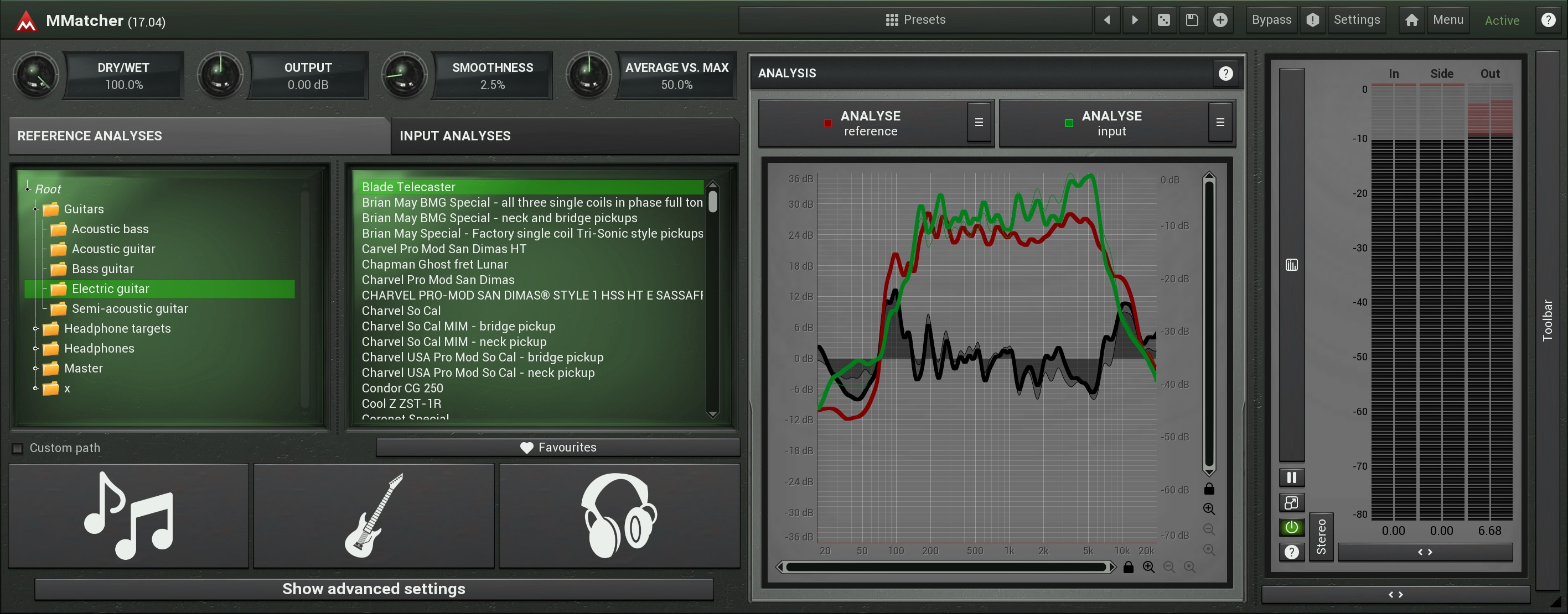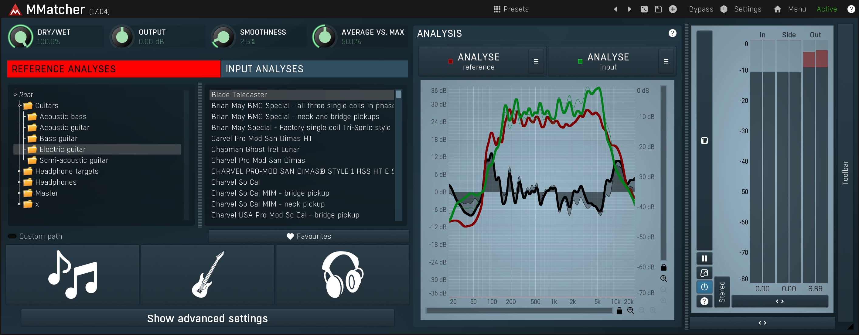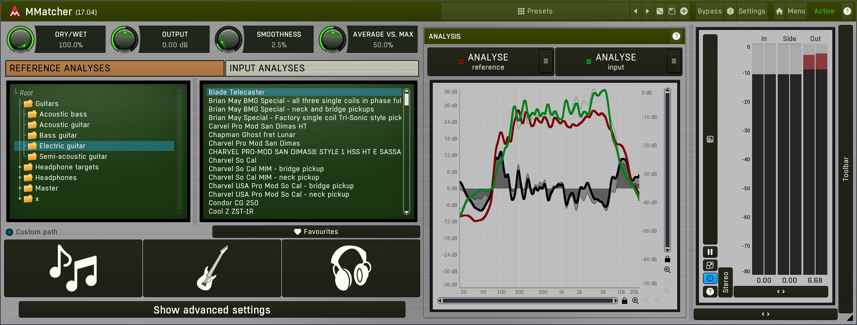 MMatcher provides a specialized database of dry electric guitar and bass sounds, created by analysing samples from hundreds of guitars sent by our users. This database allows you to experiment with and refine your instrument tones. By analyzing your guitar sound input and comparing it to these references, you can explore new sonic possibilities. The plugin simplifies the process of achieving desired guitar and bass tones. This feature offers a creative playground for guitarists and bassists, enabling them to discover and perfect their unique sound, all powered by the collective sonic experience of our user community.