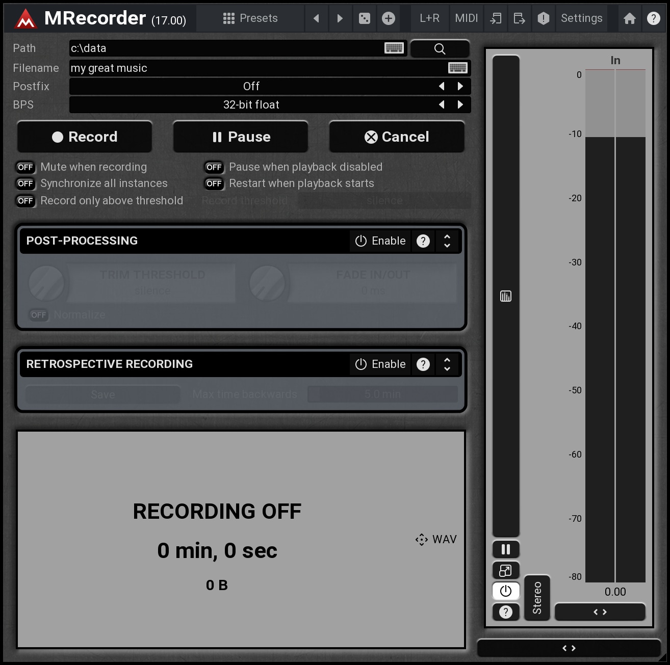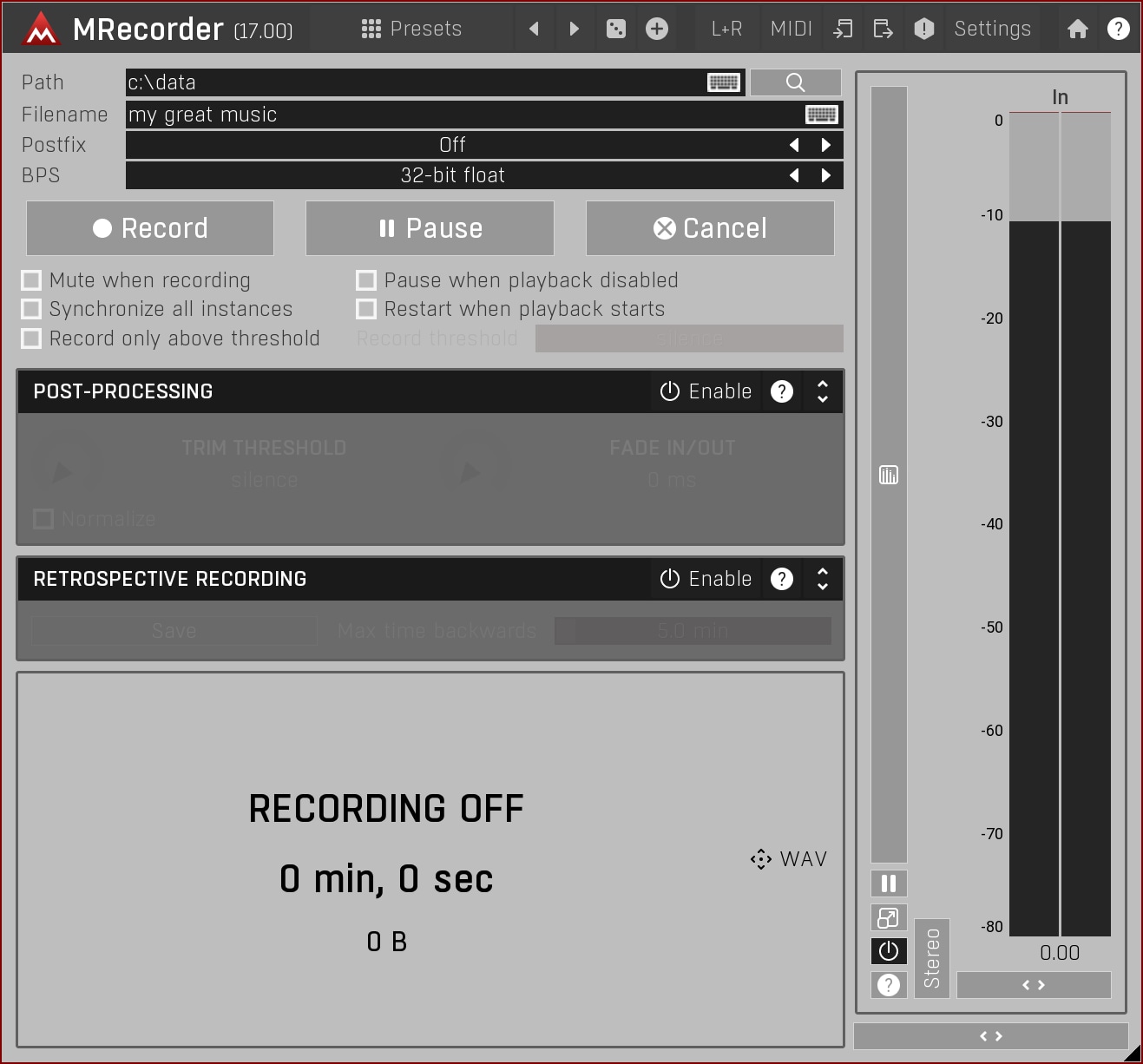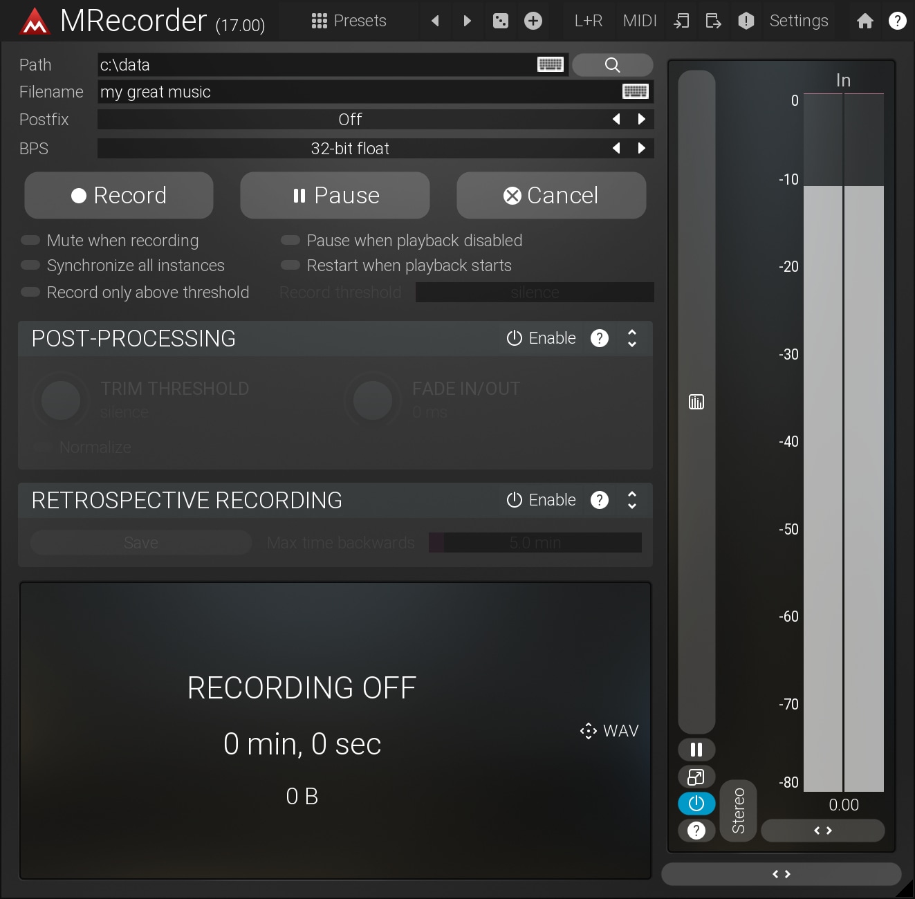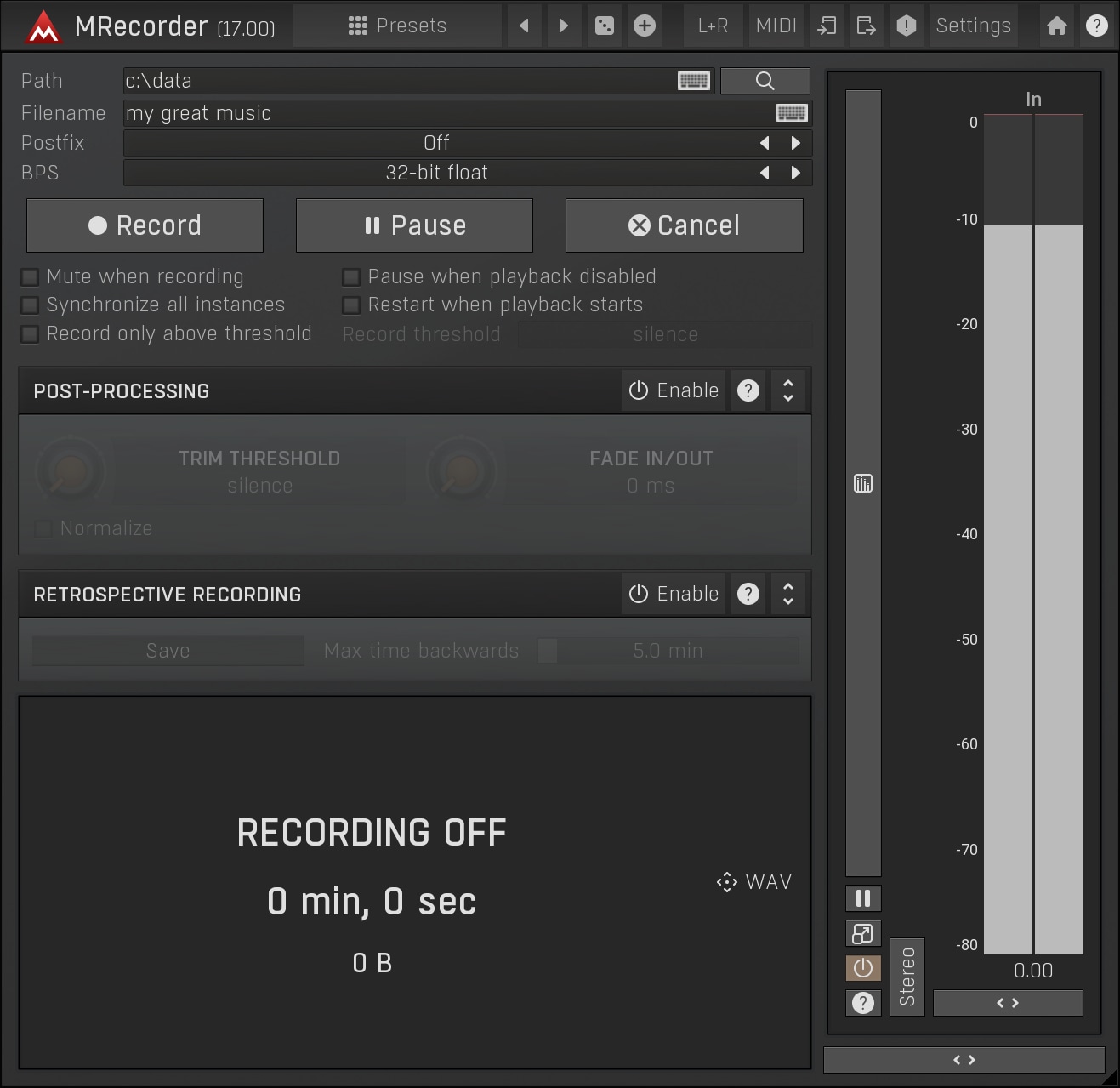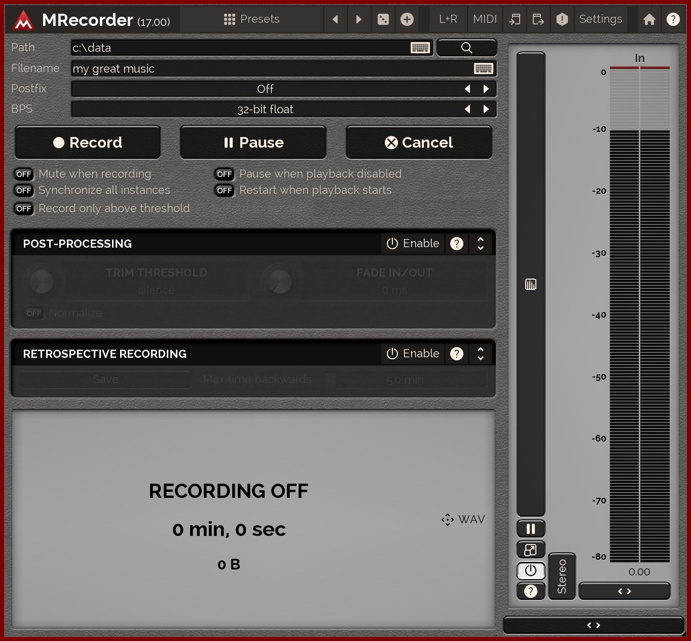 MRecorder is a simple utility for a simple job - record the plugin input into a WAV file, stored in the folder of your choosing. It may not be necesary every day, but it is good to have it when you need it.