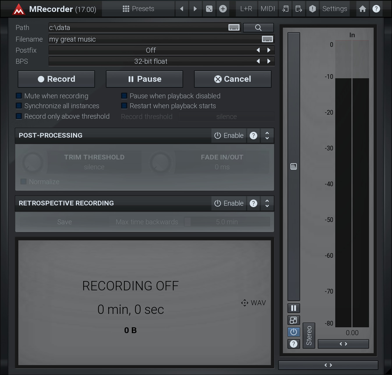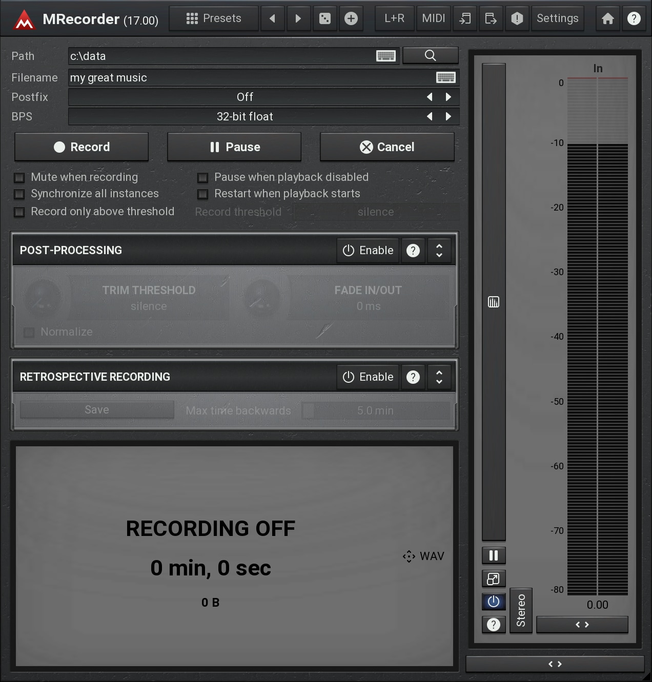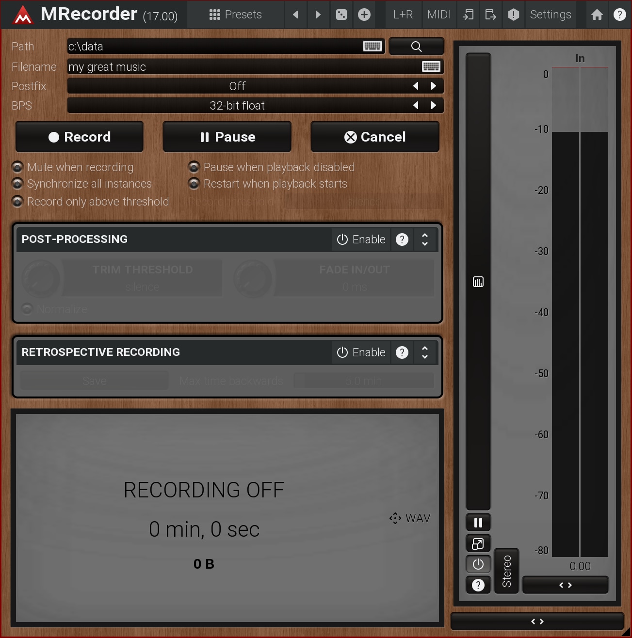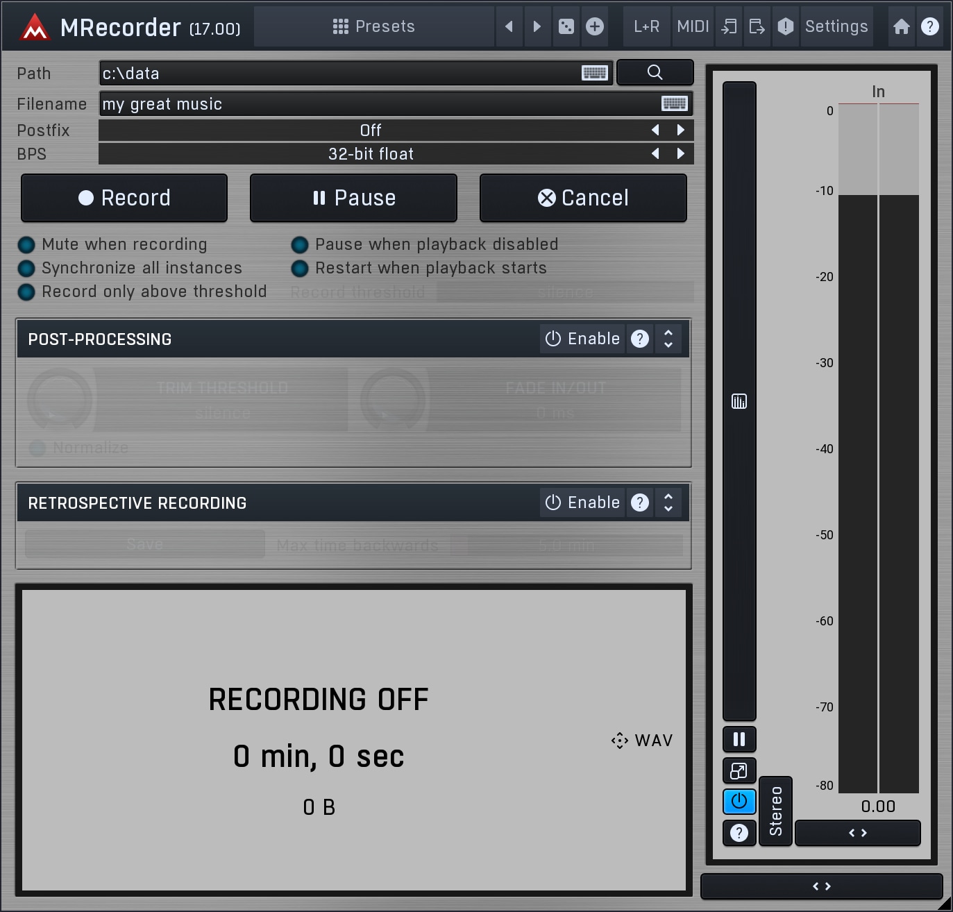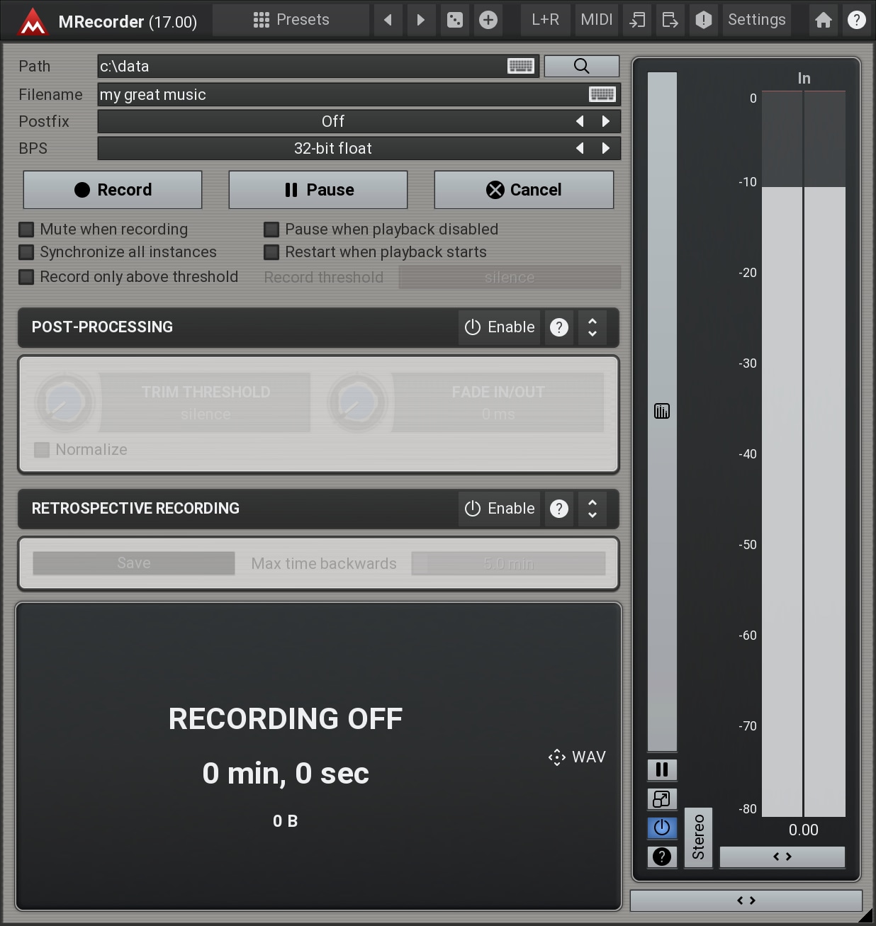 MRecorder is a simple utility for a simple job - record the plugin input into a WAV file, stored in the folder of your choosing. It may not be necesary every day, but it is good to have it when you need it.
